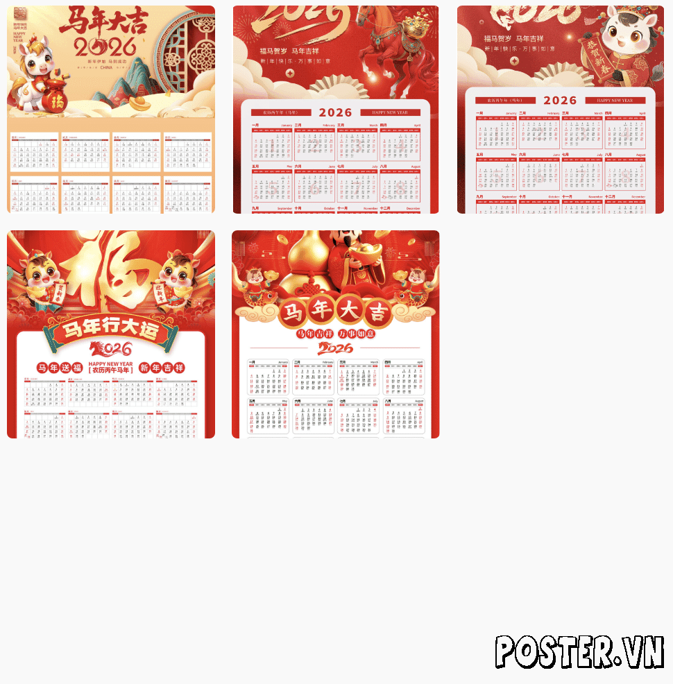 Thư viện đồ họa Poster.vn cung cấp một kho tàng mẫu Lịch Tết 2026 với đa dạng phong cách, từ truyền thống, cổ điển đến hiện đại, năng động. Dù bạn cần một mẫu lịch con ngựa 2026 uy nghi cho lịch block doanh nghiệp, hay một lịch để bàn Giáp Ngọ hoạt hình sáng tạo cho trẻ em, bạn đều có thể dễ dàng tìm thấy. Sự đa dạng này giúp bạn linh hoạt trong việc lựa chọn, đảm bảo lịch của bạn luôn mới mẻ và phù hợp với từng đối tượng cụ thể. Điều này giúp tối ưu hóa khả năng thu hút và duy trì sự chú ý của người nhận, tăng cường hiệu quả truyền tải thông điệp chào xuân Giáp Ngọ.